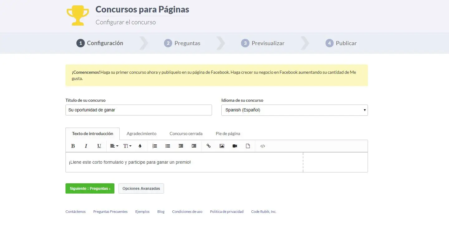 Aquí podemos elegir el título, el idioma y crear los textos predefinidos que aparecerán en la presentación (incluyendo el CTA para participar), en el mensaje de agradecimiento por participar y en el que indique que el concurso queda cerrado y, por ende, no se admiten más participaciones.
