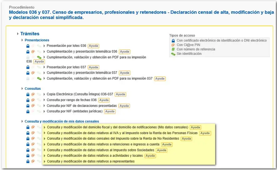 Se puede acceder a él desde la opción “presentar y consultar declaraciones” dentro de “trámites destacados” de la Sede Electrónica o desde el apartado “todos los trámites”, “Censos, NIF y domicilio fiscal”, “Censos”.