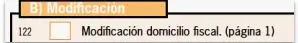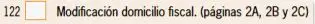 Dentro del modelo 036, la casilla a marcar para indicar el cambio de domicilio fiscal es la 122, en las páginas 2A, 2B y 2C. En el 037 es la misma casilla, pero en la página 1.