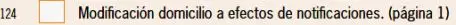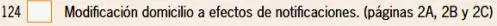 Por su parte, la casilla 124 corresponde a la modificación del domicilio a efectos de notificaciones. Es decir, el contribuyente, para efectos tributarios puede señalar un domicilio de notificaciones distinto del domicilio fiscal.