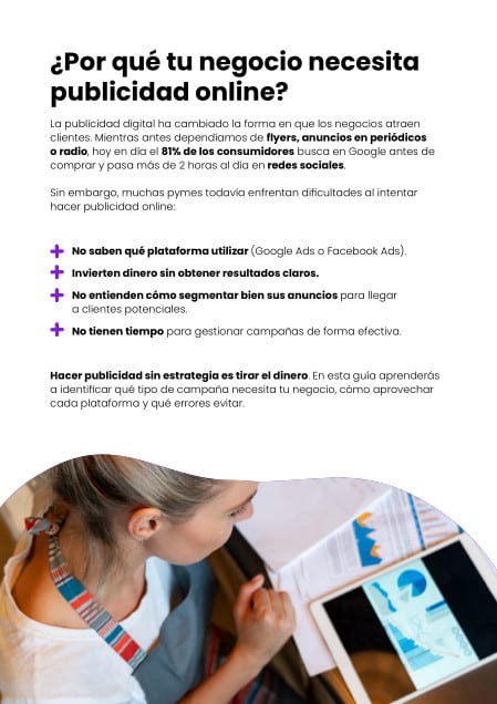 La competencia online nunca ha sido más intensa, pero con las estrategias adecuadas, es posible destacarse y atraer a los clientes adecuados. A través de este ebook, descubrirás cómo hacer publicidad online de forma efectiva, cómo elegir entre Google Ads y Facebook Ads, y qué errores evitar para no desperdiciar tu presupuesto publicitario. Aprende a identificar las campañas que mejor se adaptan a tu negocio y cómo gestionarlas de manera eficiente para obtener los mejores resultados.