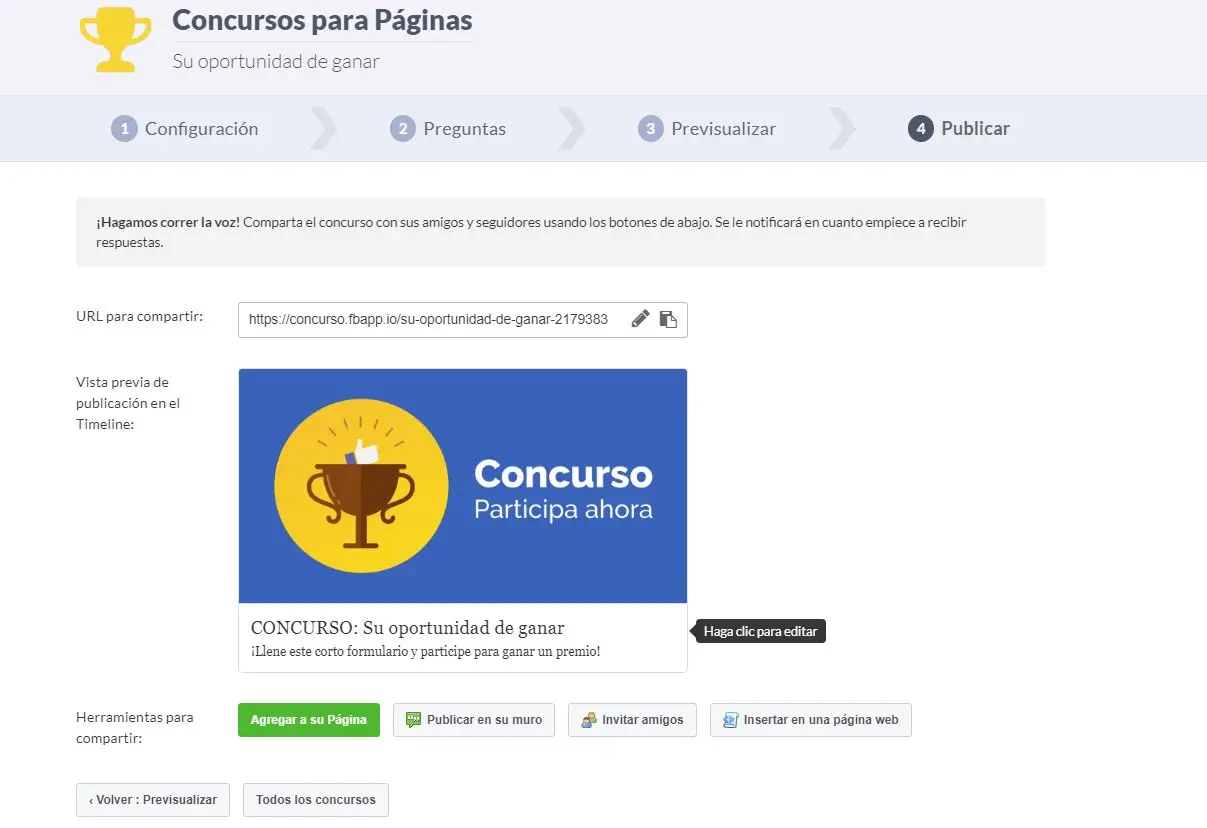 Por último, en esta pestaña podremos modificar la URL que se compartirá y la imagen que aparecerá. Facebook también nos permite recurrir a diversas herramientas para compartir, como agregar el concurso a la página, publicarlo en el muro, invitar a amigos o insertar en una página web.
