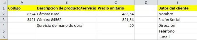 - Columna A: Aquí incluiremos el código de nuestros productos y servicios. Si no tenemos uno, éste es el momento adecuado para crearlo.