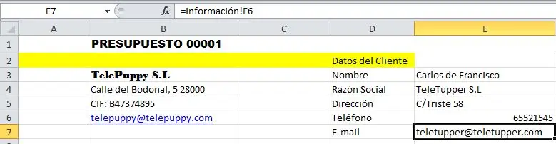 Para cambiar los datos de cada cliente bastará con referenciar el contenido de las celdas E3 a E7 con los datos de las celdas F2 a F7 de la hoja “Información” mediante la siguiente fórmula: Fx =Información!F2, Información!F3 etc. para copiar los datos de dichas celdas.