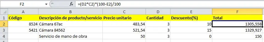 Para obtener el total de cada línea, utilizamos la función =(C*D), es decir, precio unitario por cantidad. Si queremos aplicar algún tipo de descuento, resolveríamos restando 100 al porcentaje de descuento (100-E) y lo multiplicamos por el resultado de (C*D). El resultado total lo dividimos entre 100. Como vemos en el ejemplo, nuestra fórmula base sería =(C*D)*(100-E)/100 en el caso de aplicar descuento. Si no, como en el caso del servicio de mano de obra, simplemente multiplicaríamos =C4*D4.