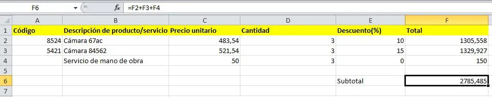 Para terminar el documento, es suficiente que sumemos los totales de cada línea, con la función =F2+F3+F4, como vemos ejemplificado. Podemos decidir si aplicarles los impuestos correspondientes aquí o bien ya en la factura si el cliente decide contratar nuestros servicios.