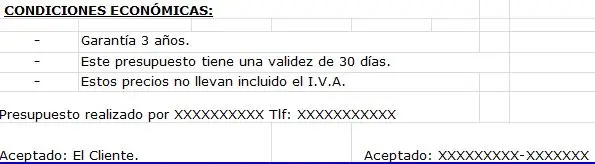 También es conveniente incluir la aceptación por parte del cliente, con firma y fecha, y una validez, por ejemplo, de 30 días naturales. Nos interesa esta opción para reafirmar nuestra imagen de profesionalidad y que nuestros clientes entiendan que quizá, si deciden contratar nuestros servicios más adelante, estos precios puede que no tengan vigencia.