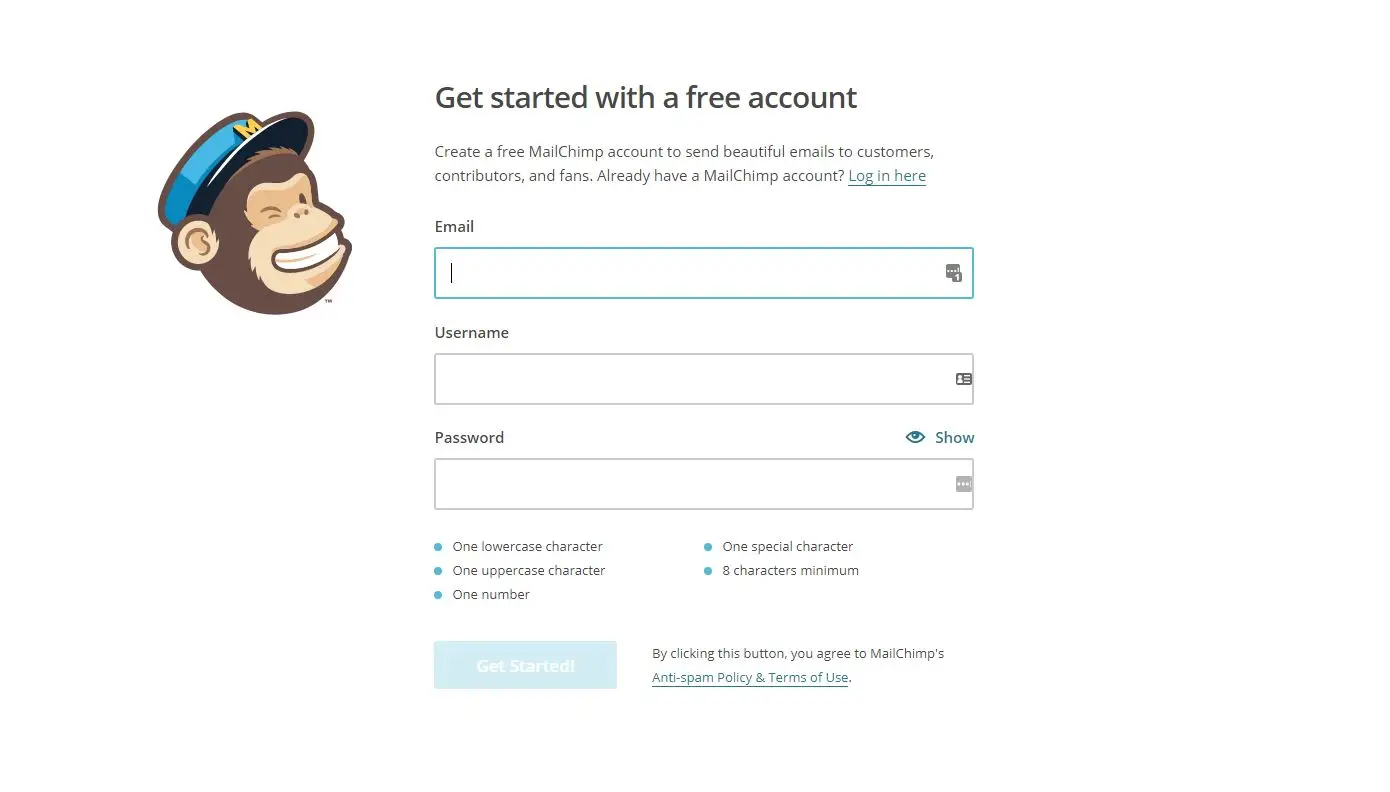 1. Entra en la web de Mailchimp e introduce tu email, tu nombre de usuario y la contraseña. A continuación indica el nombre de tu empresa y vincula, si lo deseas, la URL de tu web y las cuentas de redes sociales.